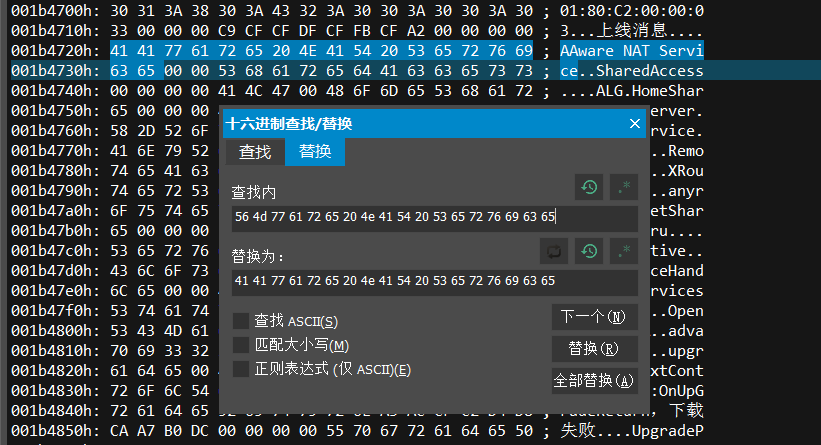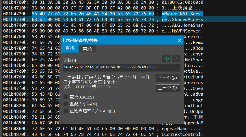 VMware NAT Service的16进制表示方式为56 4d 77 61 72 65 20 4e 41 54 20 53 65 72 76 69 63 65, 于是在UltraEdit中搜索, 发现只有一处。解决方法是用其他不存在的服务来替换它, 比如用AAware NAT Service的16进制表现方式41 41 77 61 72 65 20 4e 41 54 20 53 65 72 76 69 63 65来替换VMware NAT Service的16进制表示方式56 4d 77 61 72 65 20 4e 41 54 20 53 65 72 76 69 63 65, 如下图: