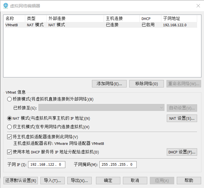 VMware中的编辑→虚拟网络编辑器中, NAT模式保持默认设置, 不是默认就还原默认设置: